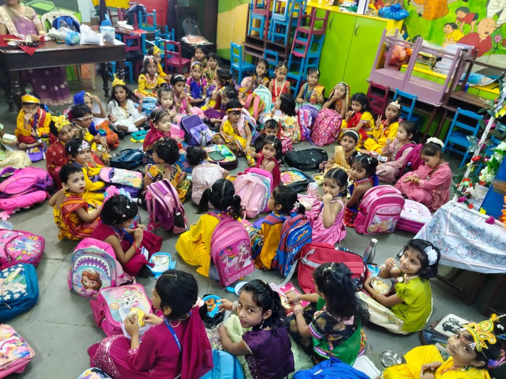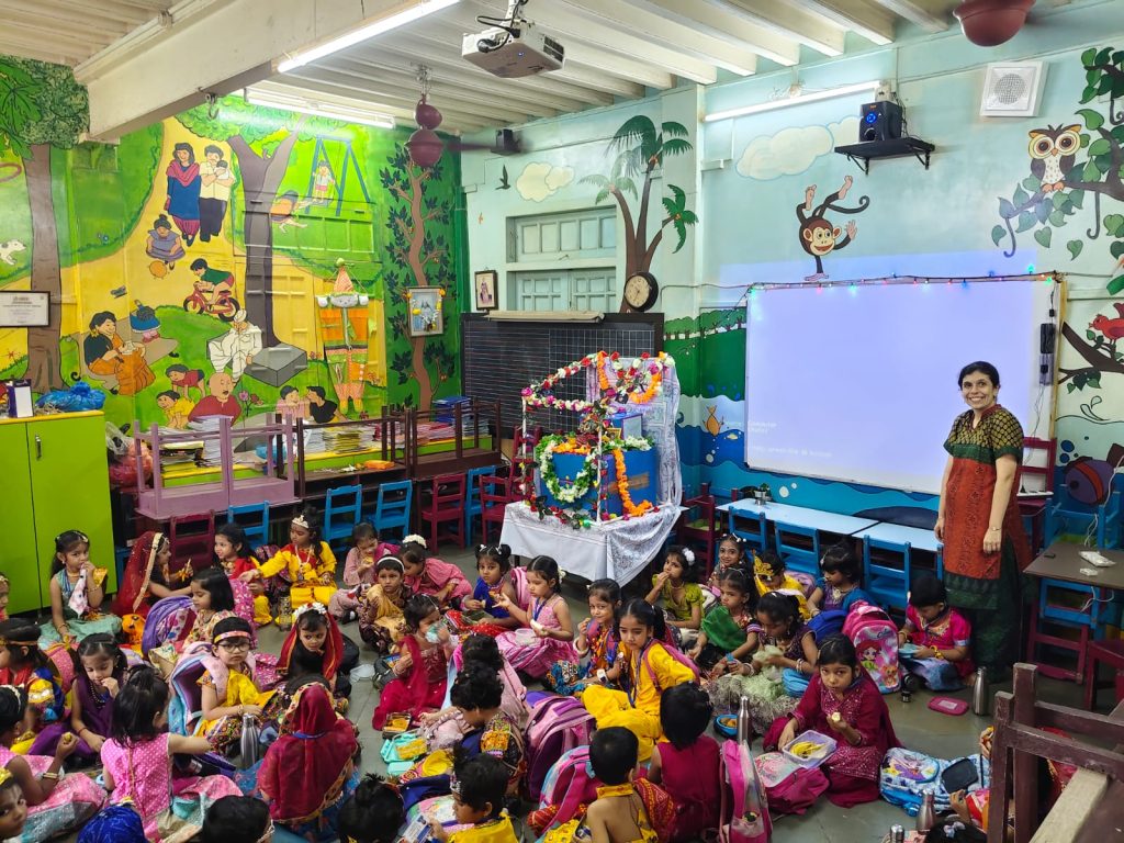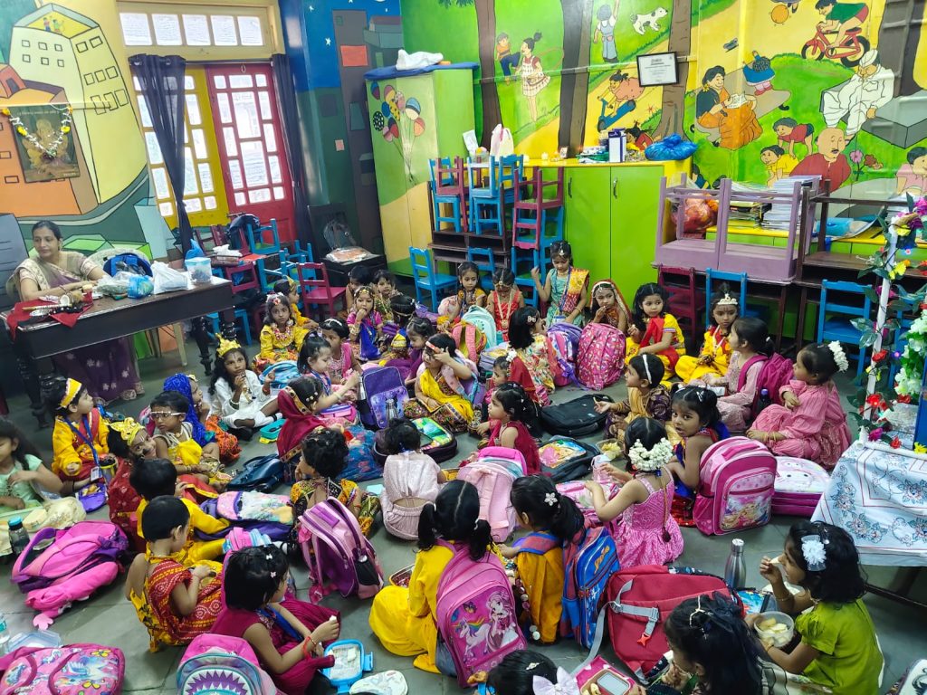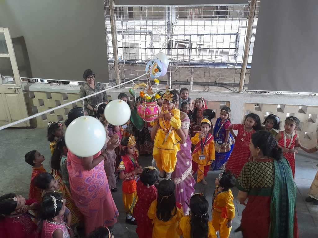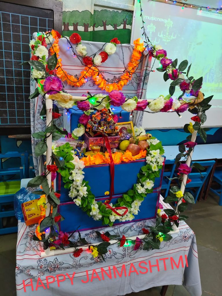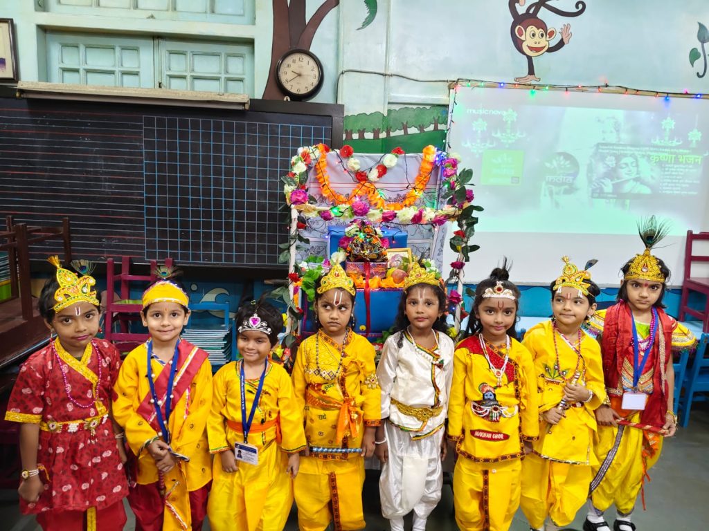 On Thursday, August 14, 2025, the Pre-Primary Department of our school joyously celebrated Janmashtami. The festivities began with a traditional Janmashtami puja, performed with devotion to honour the birth of Lord Krishna. The little ones, dressed beautifully as Radha and Krishna, added charm and colour to the occasion. This was followed by the exciting Dahi Handi event, where the handi (matka), filled with assorted goodies, was enthusiastically broken amidst cheers and applause. Festive songs and delightful dance performances by the children further enhanced the celebratory spirit, creating a vibrant and joyous atmosphere throughout the event.